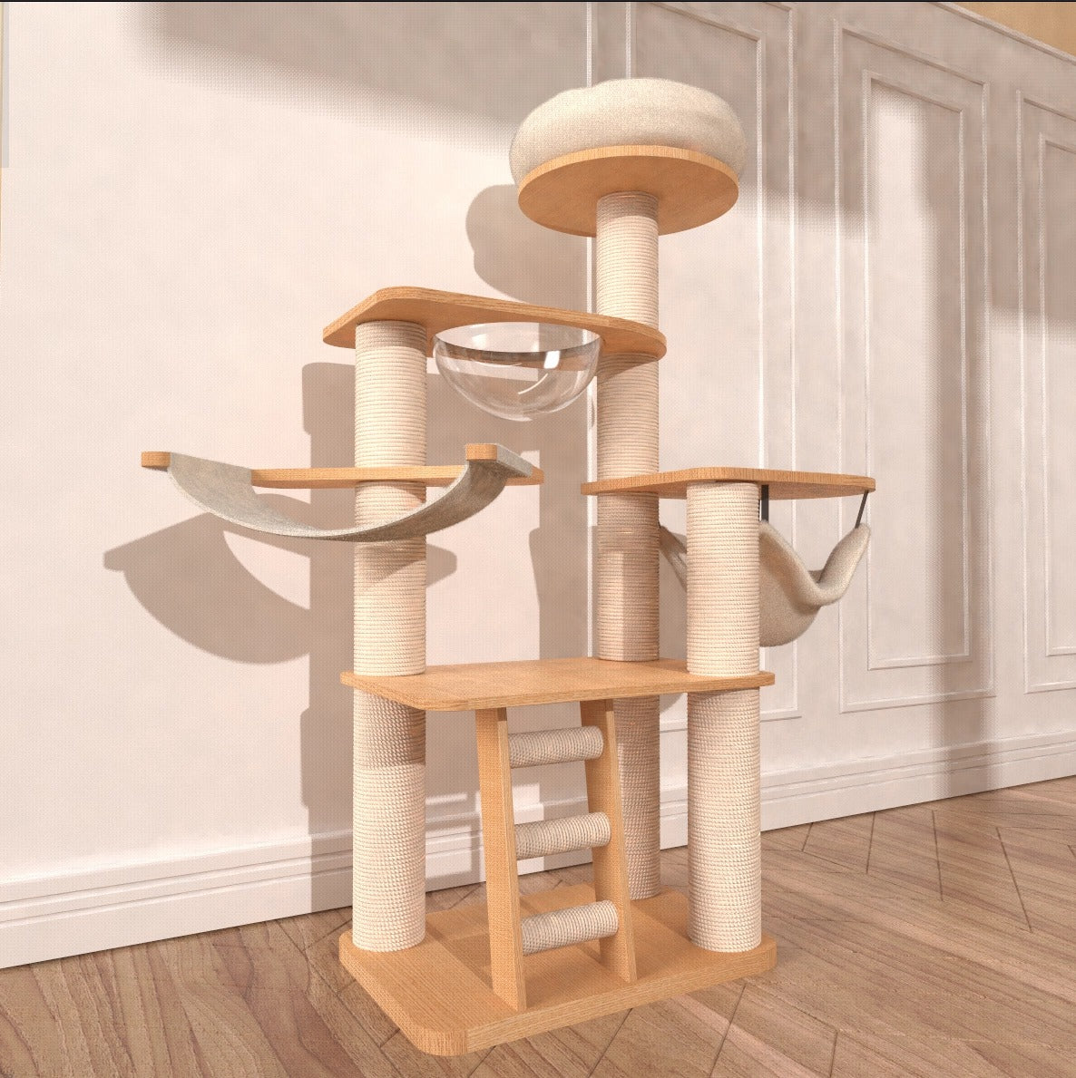 高質橡木純實木多功能貓爬架連太空艙貓窩 R1 (加粗貓抓柱5層款|140cm)