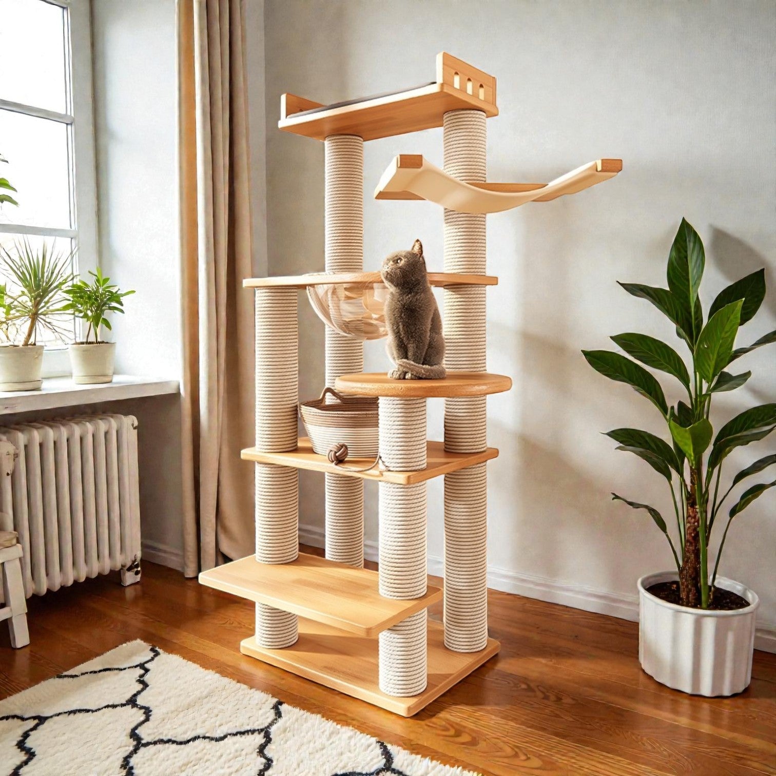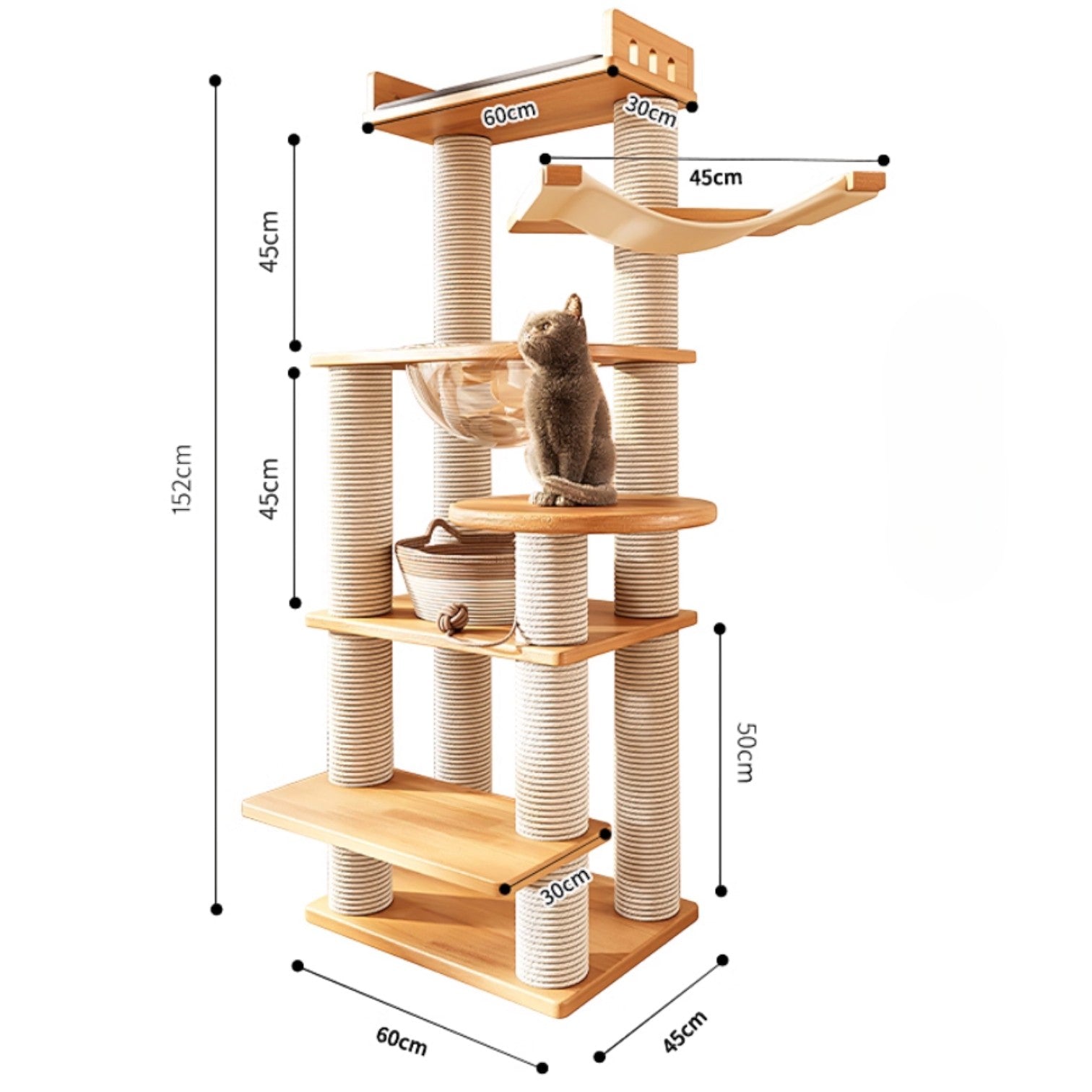 橡木清爽通風清涼實木劍麻柱貓爬架 (太空艙6層款|152cm)