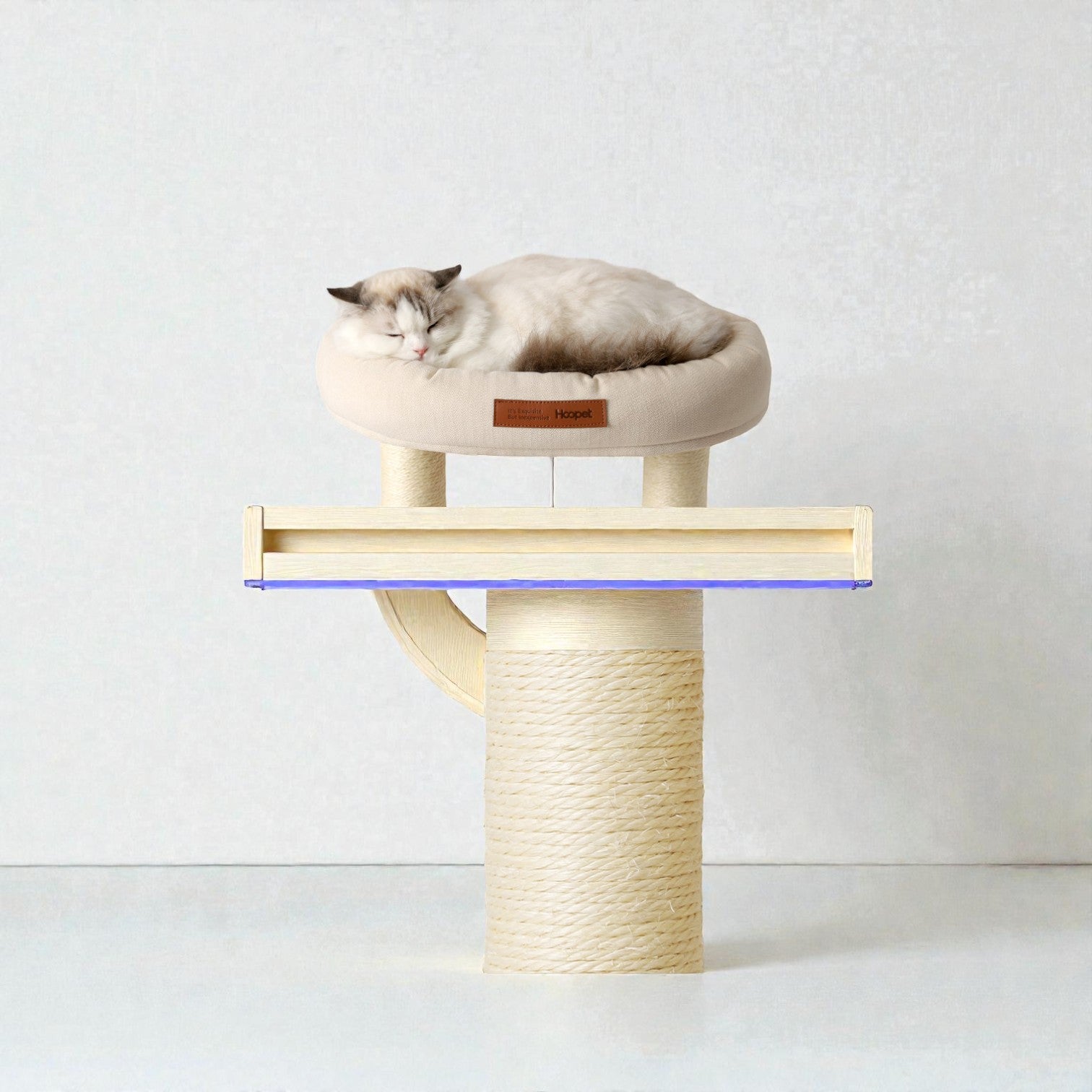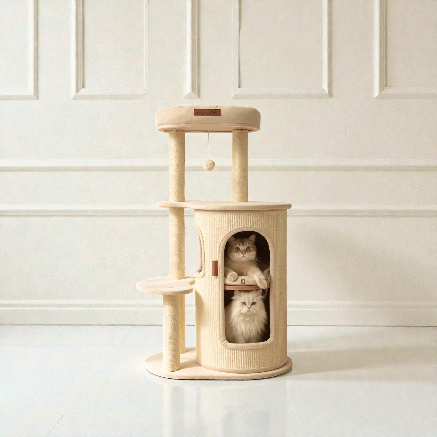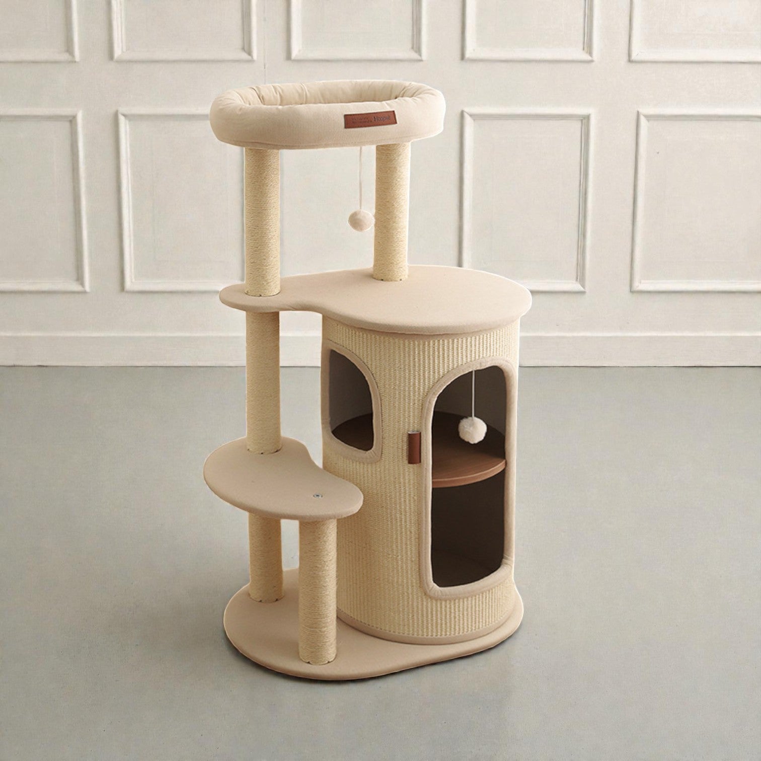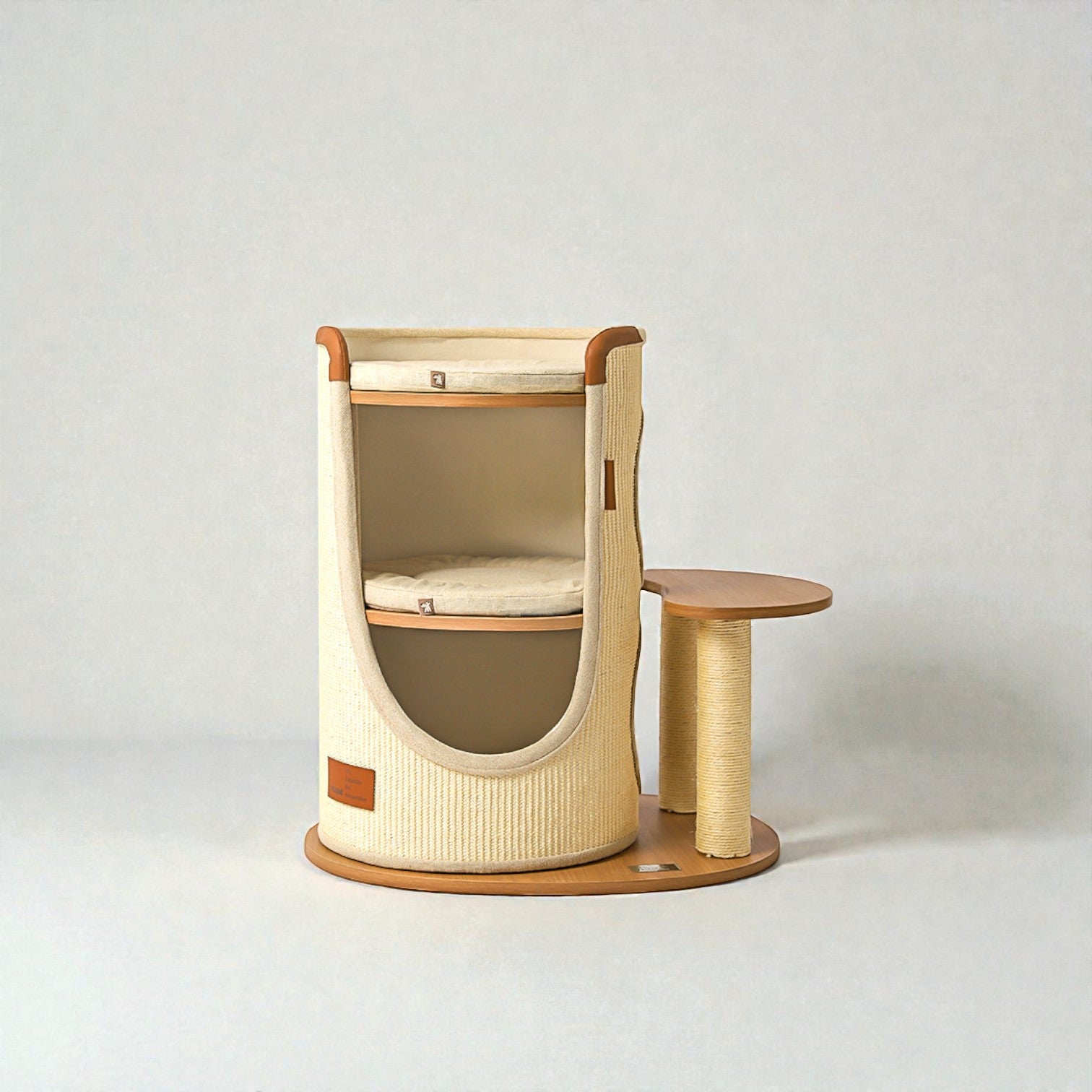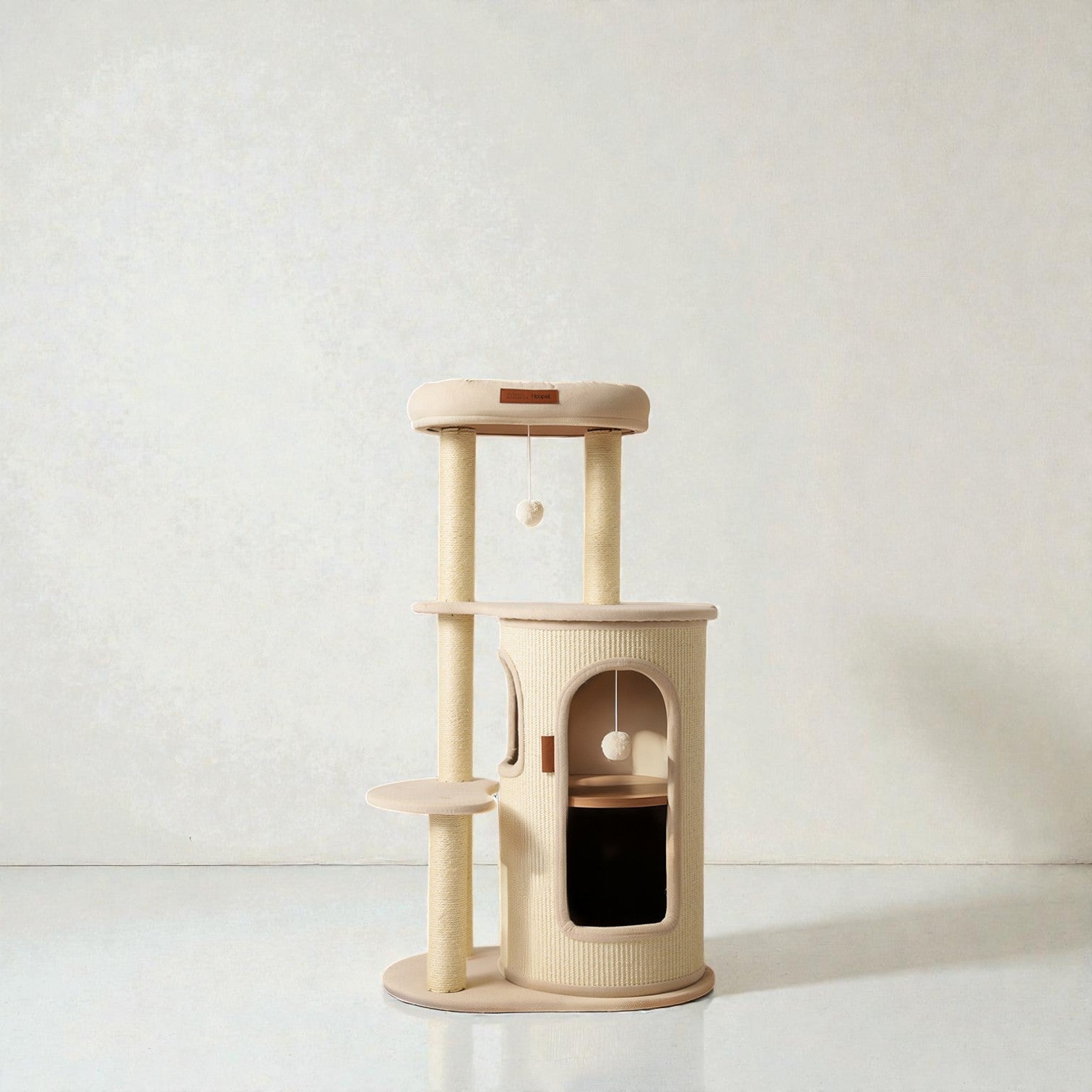 針對香港居住環境有限而設計,Hoopet 假日系列將「垂直空間」利用到極致。這款貓別墅集睡眠、磨爪、攀爬與觀景於一身,不僅是寵物的樂園,其優雅的仿木與棉麻質感,更能完美融入現代簡約、北歐或日系家居風格。