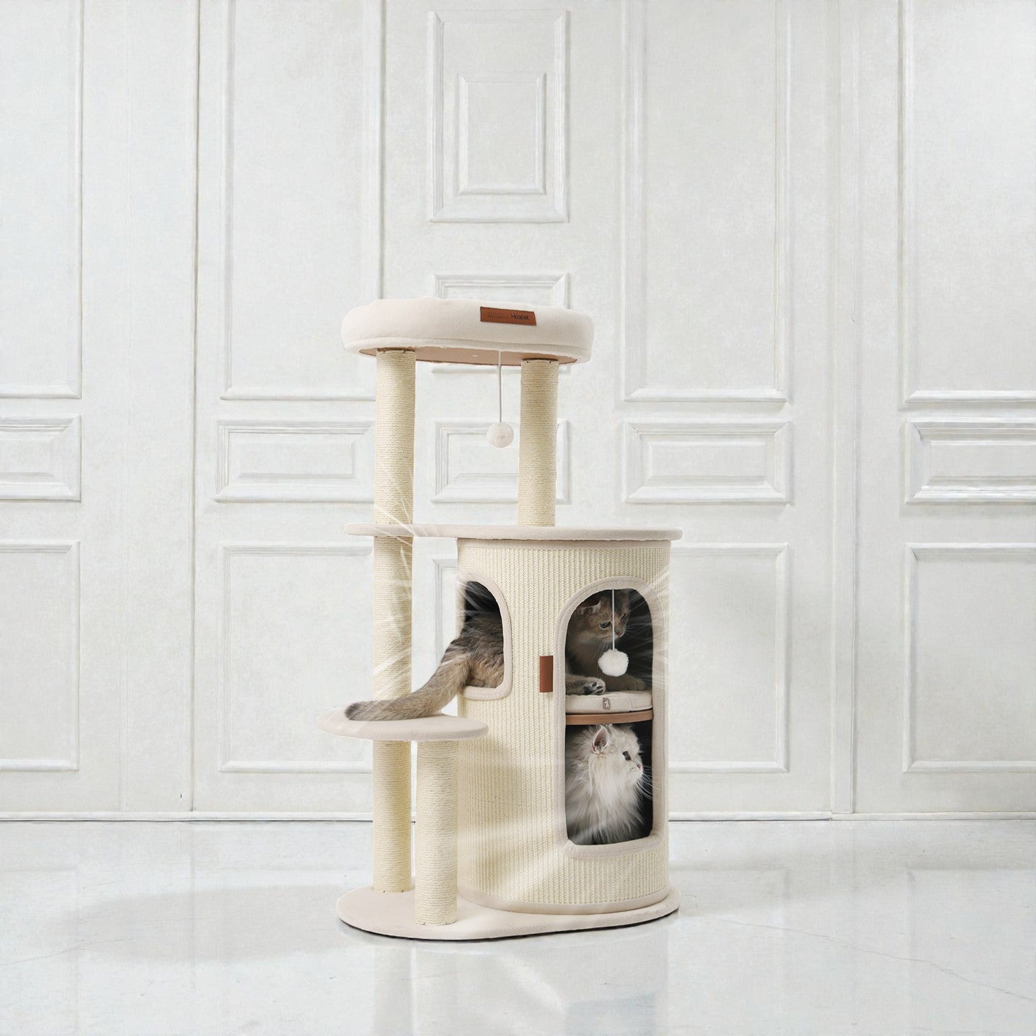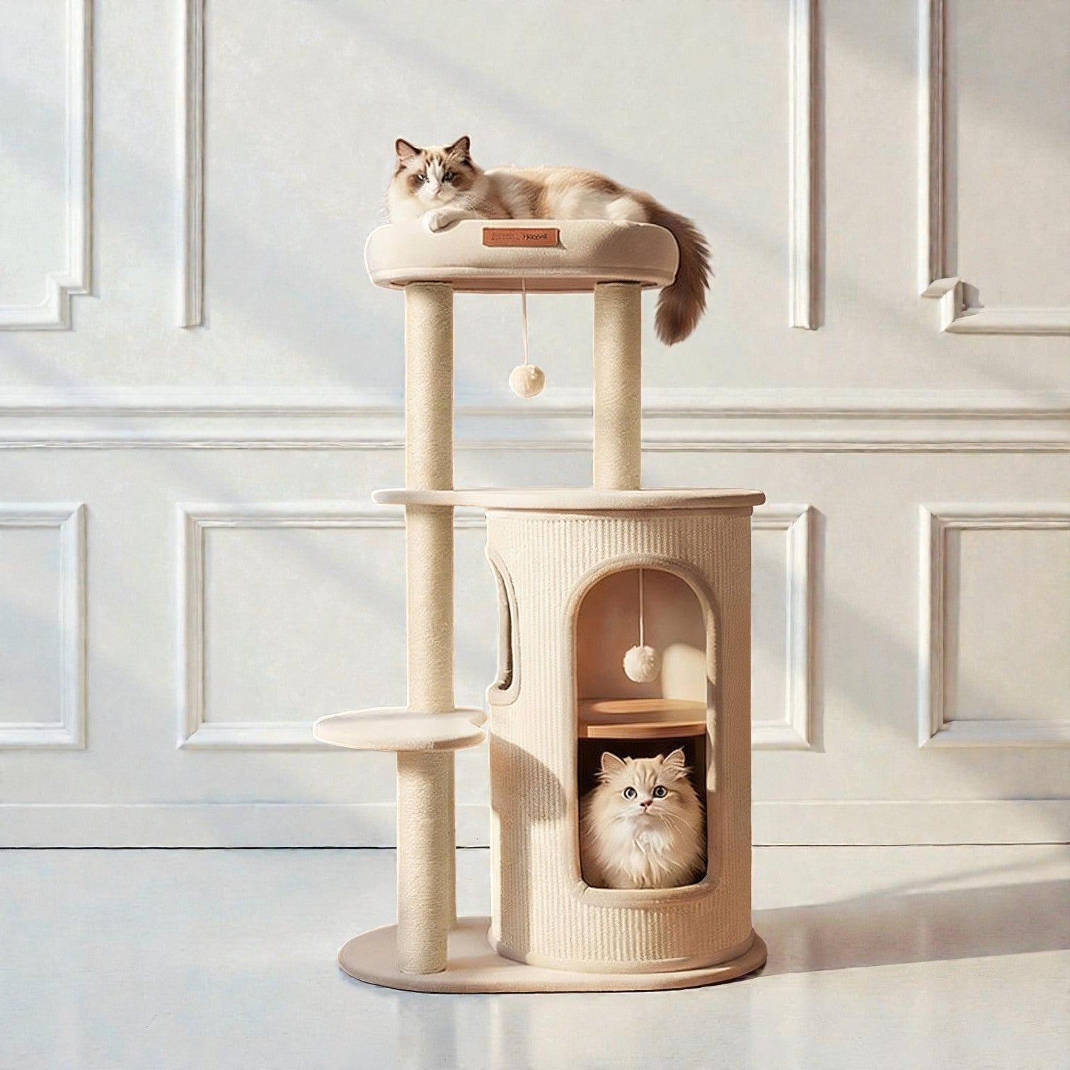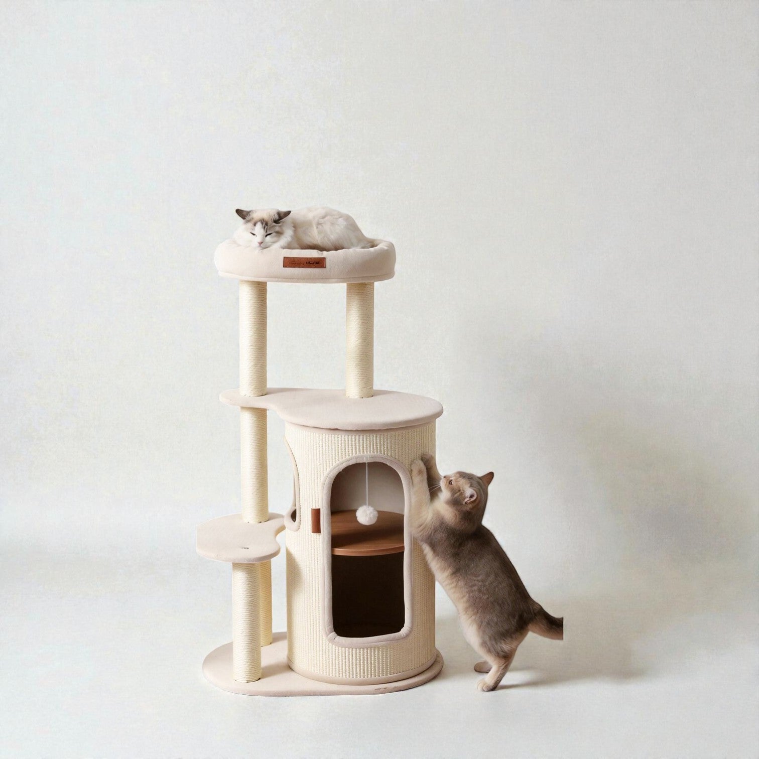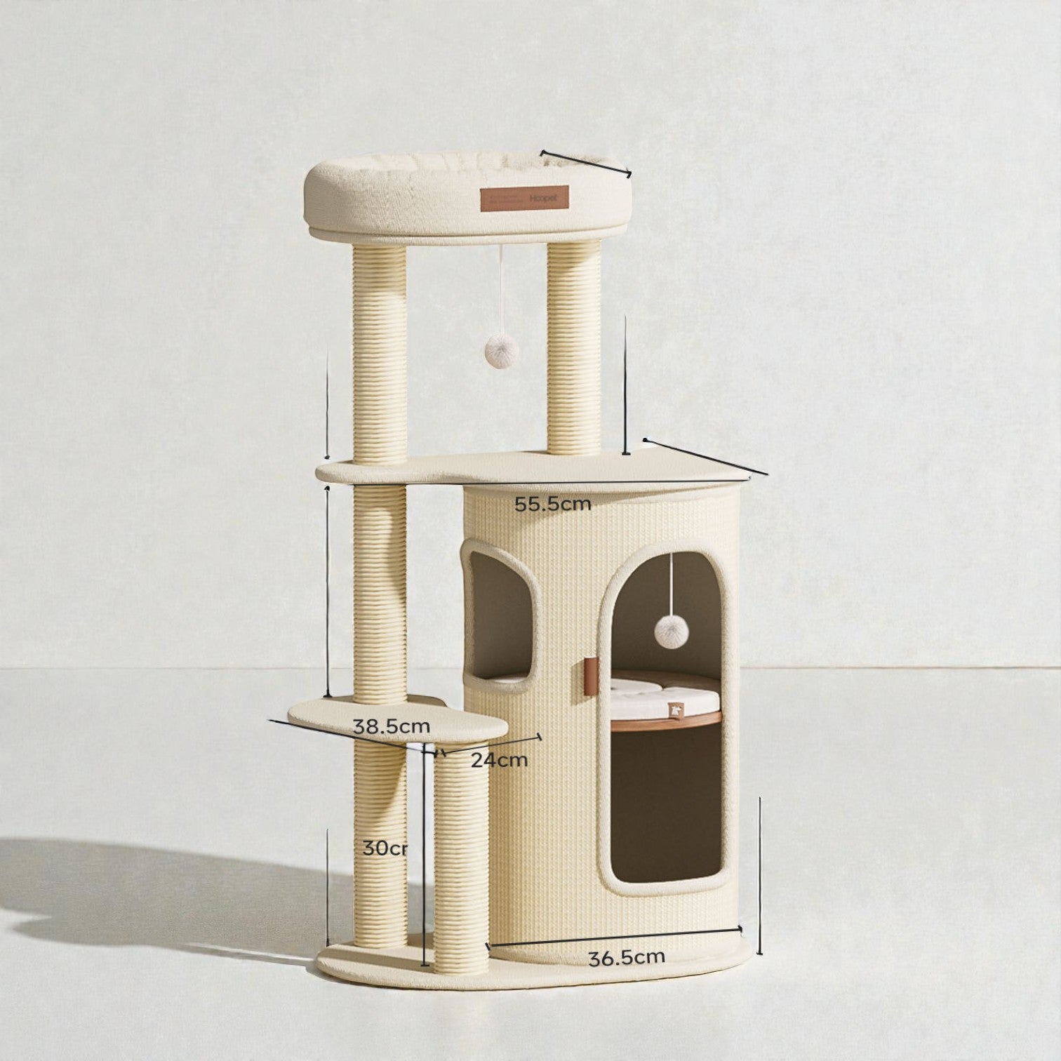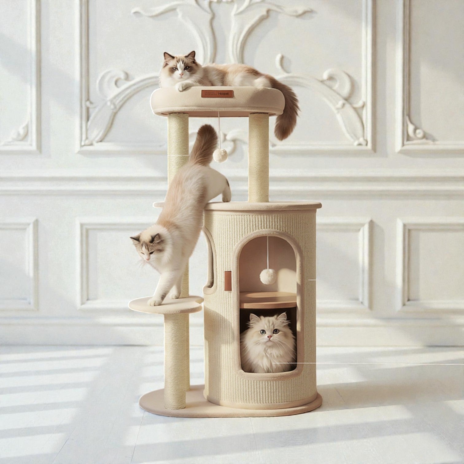 針對香港居住環境有限而設計,Hoopet 假日系列將「垂直空間」利用到極致。這款貓別墅集睡眠、磨爪、攀爬與觀景於一身,不僅是寵物的樂園,其優雅的仿木與棉麻質感,更能完美融入現代簡約、北歐或日系家居風格。